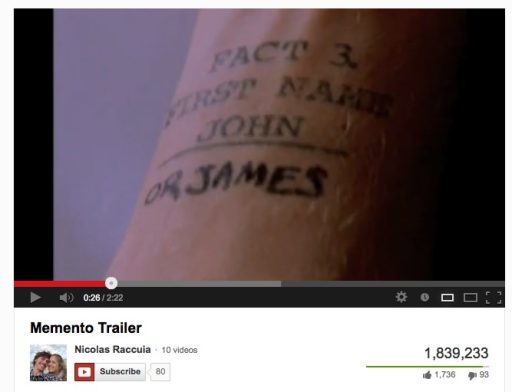 Leta 2000 Christopher Nolan posnel odličen film z naslovom Memento. Zgodba filma je precej preprosta – izguba kratkotrajnega spomina pri bivšem zavarovalniškem raziskovalcu in zadnji spomin na to, da mu je nekdo umoril ženo. Problema izgube kratkotrajnega spomina se loti na zanimiv način – piše si listke, tetovira si stvari,… Vendar je vse skupaj precej nepovezano, dokler se film ne začne vrteti nazaj in se odkrijejo povezave med njegovimi zapiski.
