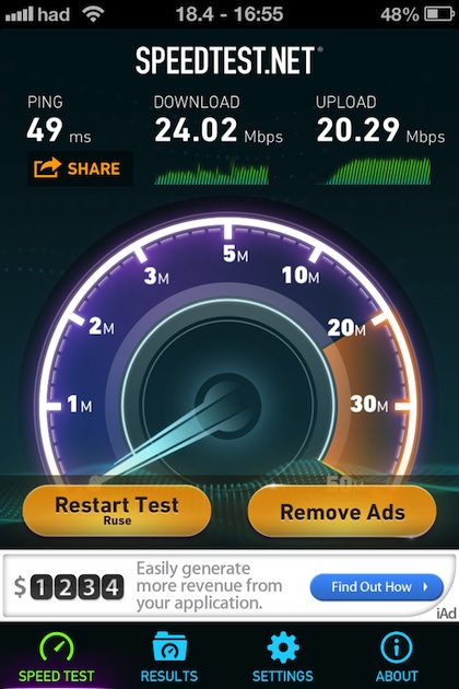 - hitrosti prenosa podatkov do 100 Mb/50 Mb. Dejanske hitrosti so odvisne od precej dejavnikov, zato sem tudi sam testiral to na različnih lokacijah po Ljubljani in Bledu
