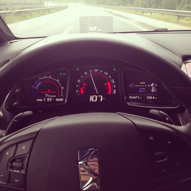 Citroen DS5 do 60 km/h vozi na električno energijo (če ni prehitrega pospeševanja, kar sporoča velik zaslon), potem se preklopi na dizelski motor. Polnjenje akumulatorjev poteka preko sistema zaviranja, ali pa zmanjševanja hitrosti – zaslon na armaturni plošči, ki je namenjen temu je zanimiv za opazovanje in prvih nekaj kilometrov je bil ves moj čas posvečen njemu. Voznik ima lahko vklopljene različne prikaze, kaj se dogaja z vozilom. Vožnja z vozilom je dejansko podobna vožnji s “space shuttlom” – ne, nisem se še peljal z njim, vendar nekako tako si predstavljam vožnjo z njim. In vozilo ima, kljub precej veliki teži, dobre pospeške in odlično lego na cesti.