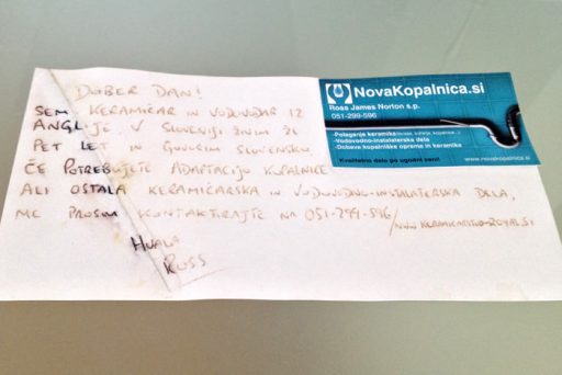 No tale pa me je presunila, namreč, ko sem prebrala samo prvi del oglasa “Sem keramičar in vodovodar iz Anglije.” sem takoj pomislila na Ross-a. Ross-a poznam že vsaj pet let in res je super fant. Spoznala sem ga ko je še učil v jezikovni šoli Berlitz v Ljubljani in se prebijal skozi življenje v Sloveniji. Ker sva vme izgubila stik, me zelo veseli, da je še tu in da mu je uspelo. Tudi sama sem se pogovarjala z njim o obovi lastne kopalnice, vendar se potem predvsem zaradi finančnih razlogov za to nisem odločila. Sem pa videla njegovo delo in fant je res super in zelo priden.