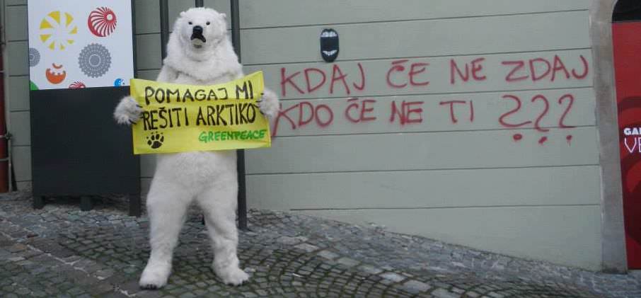 Brez črpanja nafte na Arktiki!Pod arktičnim morjem naj bi se nahajalo okoli 90 milijard sodčkov nafte. Takšna količina bi zadovoljila današnje svetovne potrebe po nafti zgolj za tri leta. Kljub temu se je med velikimi naftnimi multinacionalkami, kot so Shell, Gazprom, BP in Exxon, začel boj za arktično nafto – vsi si želijo iz izginjajoče mase ledu kovati dobiček. Ruska multinacionalka Gazprom je že napadla Arktiko: že letos naj bi na naftni ploščadi »Prirazlomnoye« na severu Rusije začela s črpanjem.