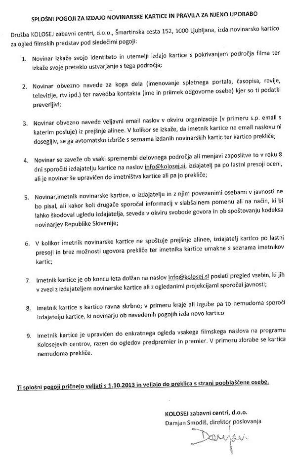 Lenart Kučič je danes na Twitterju objavil zelo zanimiv primer, kako Kolosej tretira novinarje. Napisana imajo pravila za izdajo novinarske kartice in njeno uporabo. Super, bi človek pomislil in v bistvu bi se marsikdo strinjal s tem, da je potrebno določiti pogoje uporabe. Ampak v primeru Koloseja je vse skupaj milorečeno čudno.