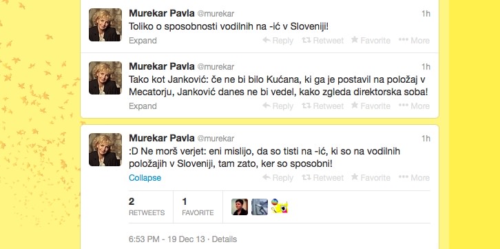 Zelo zanimivo je, da je gospa Murekarović lastnica in direktorica podjetja Tehnokrat d.o.o., ki je v letu 2011 ustvarilo -262 EUR, v letu 2012 pa -1.361 EUR dobička in je kot taka zagotovo kompetenta za presojo managerskih in voditeljskih sposobnosti drugih. Poleg tega se mi osebno poraja tudi dvom, če v svoji službi karkoli dela, glede na to da vsake pol ure twitta.