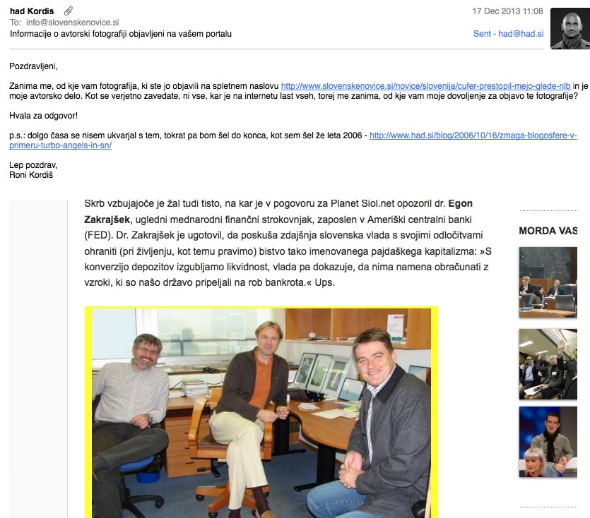 Zanima me, od kje vam fotografija, ki ste jo objavili na spletnem naslovu http://www.slovenskenovice.si/novice/slovenija/cufer-prestopil-mejo-glede-nlb in je moje avtorsko delo. Kot se verjetno zavedate, ni vse, kar je na internetu last vseh, torej me zanima, od kje vam moje dovoljenje za objavo te fotografije?
