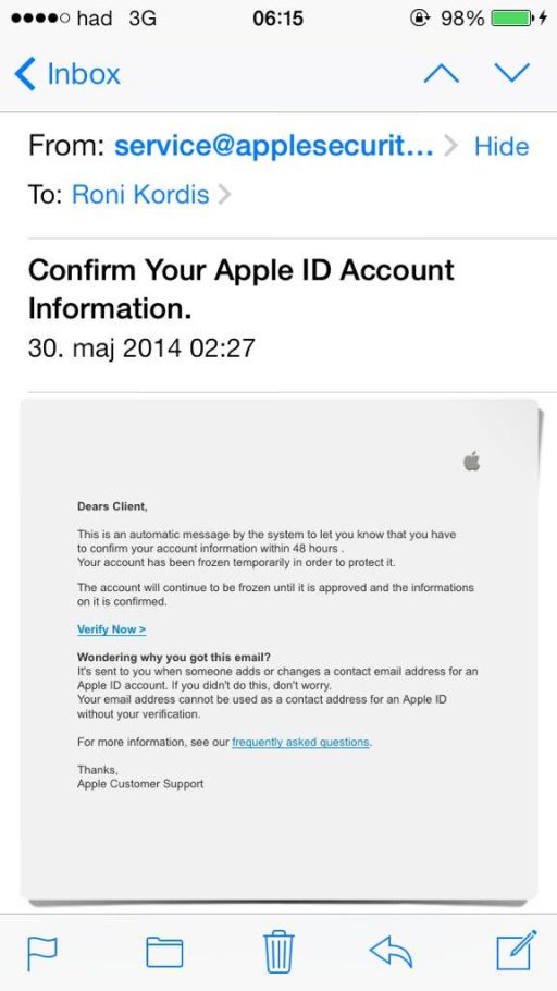 Ni vse, kar dobite na elektronski naslov tudi resnično. O tem sem pisal že večkrat, vendar me vedno znova presenetijo elektronska sporočila, ki delujejo precej realno, vendar so v resnici samo #scam. In marsikdo klikne na povezavo in potem pusti svoje podatke – v tem primeru podatke za dostop do Apple računa, ki je pogosto povezan tudi s kreditno kartico in se ga lahko preprosto izkoristi v čudne namene. Torej, vedno znova – previdno s temi stvarmi, predvsem pa vedno znova preverite od kje prihaja elektronsko sporočilo.