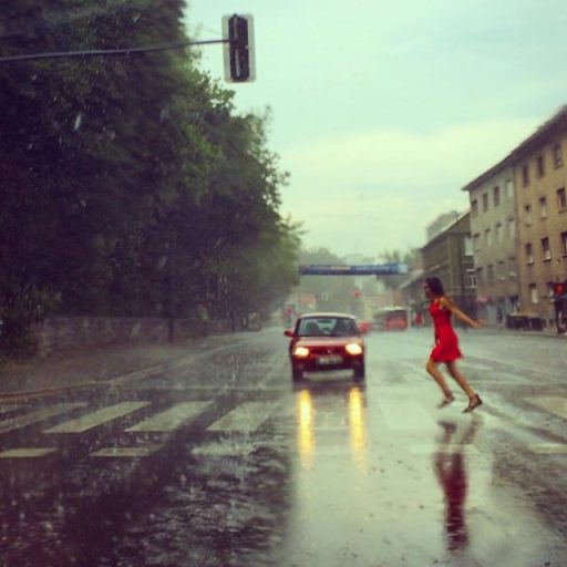 Četrtek. Ravno sem se odpravljal iz Tivolija, ko se je v parih sekundah spremenilo vreme. Namesto sonca je pričelo deževati in vmes je padala tudi toča. Par minut sem počakal v avtu, ker je tako močno deževalo, da se ni nič videlo in potem odpeljal. Medtem ko sem čakal na rdečem semaforju, sem jo opazil na drugi strani ceste. Dekle v rdečem, ki je nestrpno čakala, da se ji prižge zelena luč, medtem ko je dež padal po njeni rdeči poletni obleki. Jaz sem zapeljal v križišče, ko sem videl, da je dekle naredila prvi korak po prehodu za pešče. Ustavil sem se, spustil steklo in vzel v roke telefon. Čakal sem, da se približa in imel sem srečo, da sem ujel zelo dober moment, ko je bila z obema nogama v zraku, dobil njen odsev, za njo rdeč avto in vse ostalo “zablurano”.
