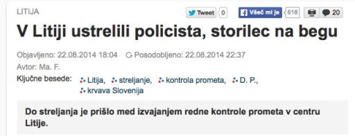 Druga stvar, ki me je zmotila pa je, da mediji delijo informacijo o streljanju na policista na družbenih medijih in da ljudje to z največjim veseljem lajkajo – 618 lajkov novice V Litiji ustrelili policista, storilec na begu pač ni nekaj, na kar bi bil kdorkoli lahko ponosen, ali bi se dičil s tem. Mediji bi lahko malce bolj kritično ocenjevali, kaj naj se deli na družbenih omrežjih in kaj ne.