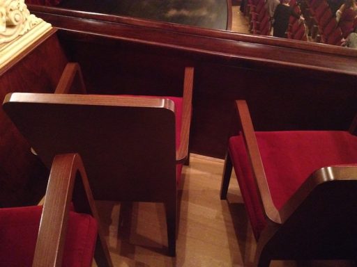 In tukaj pridem do problema, ki ga na začetku ni bilo – seveda se lahko motim in sem samo zamešal vse skupaj. Namreč v “ložah” na nadstropjih so očitno menjali stole in sedaj je situacija precej smešna – namreč ne poznam človeka, ki bi se lahko spravil v ta stol in sedel celo predstavo?! Mogoče pa je samo arhitekt napačno predvidel velikost lož in so bili stoli že naročeni – le kdo bi se sekiral. Ali pa prakticirajo sedenje “po turško”, ali kaj tretjega, kar jaz preprosto ne razumem in ne poznam. Verjetno je to opazil še kdo drug, ki je sedel v “loži” v nadstropju in ni mogel sedeti v “prvi” vrsti, ampak je predstavo gledal iz “druge” vrste.