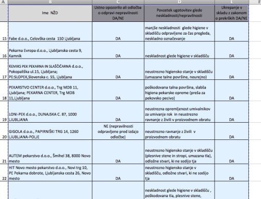 | Lan-kol d.o.o., PE Primorska pekarna Koper, Vojkovo nabrežje 1, 6000 Koper | DA | neskladnost glede higiene v skladišču | DA |