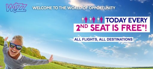 This promotion applies on 19 of May from 00.00 hour to 24.00 CET only if you purchase minimum two (2) seats or more, at the same time as part of the same booking, for the same flight operated by Wizz Air Hungary Ltd. (W6) booking may include maximum six (6) passengers. Every second seat purchased will be free, up to a maximum of three free seats per booking. The term “free” means that you will not be charged the fare including taxes, other non-optional charges and a small cabin bag (max: 42*32*25 cm) (but excluding the administration fee) for the free seat. The administration fee will be payable for each free seat. Large cabin bags and each piece of checked-in baggage are subject to additional fees.