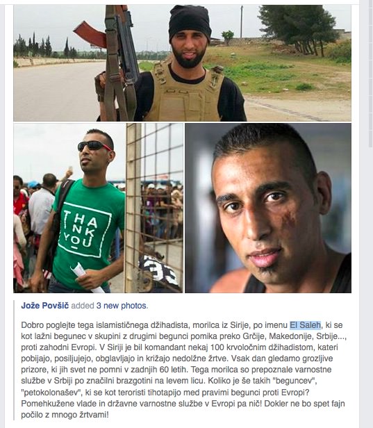 Dobro poglejte tega islamističnega džihadista, morilca iz Sirije, po imenu El Saleh, ki se kot lažni begunec v skupini z drugimi begunci pomika preko Grčije, Makedonije, Srbije…, proti zahodni Evropi. V Siriji je bil komandant nekaj 100 krvoločnim džihadistom, kateri pobijajo, posiljujejo, obglavljajo in križajo nedolžne žrtve. Vsak dan gledamo grozljive prizore, ki jih svet ne pomni v zadnjih 60 letih. Tega morilca so prepoznale varnostne službe v Srbiji po značilni brazgotini na levem licu. Koliko je še takih “beguncev”, “petokolonašev”, ki se kot teroristi tihotapijo med pravimi begunci proti Evropi? Pomehkužene vlade in državne varnostne službe v Evropi pa nič! Dokler ne bo spet fajn počilo z mnogo žrtvami!