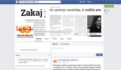 Proti zrežiranemu stečaju T-2 je Facebook stran, ki so jo pred parimi dnevi postavili “nekdanji” lastniki družbe T-2, d. o. o., (Garnol, d. o. o., Gratel, d. o. o., in Lokainvest, d. o. o.,), ki so tudi njeni upniki. Na njej komentirajo in razkrivajo skrivnosti, ki se dogajajo v ozadju stečaja T-2. V parih dneh so prišli do 1900 “lajkov” in objavili kar nekaj vsebin (vir).