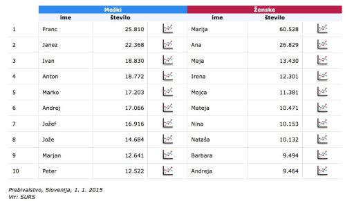 Podatki, ki jih vsako leto predstavi Statistični urad RS so vedno zanimivi, saj se da iz njih razbrati marsikaj. Namreč imena kot so Franc, Janez, Ivan, Anton imajo moški, ki so v povprečju stari okoli 60 let, prav tako je pri ženskah, kjer je povprečna starost oseb z imenoma Marija (68,3) in Ana (53,9), kar nakazuje obdobje v katerem so se največj uporabljala ta imena.