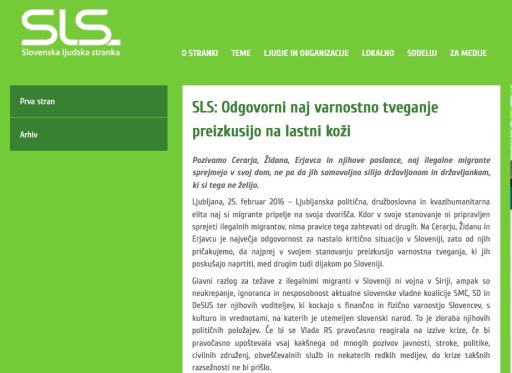 Migrantska kriza v ljudeh prebuja strahove in ljudje pišejo neumnosti. Tudi političnim strankam se dogajajo podobne stvari. Stranka SLS je včeraj na svojem spletnem mestu objavila zapis z naslovom – SLS: Odgovorni naj varnostno tveganje preizkusijo na lastni koži (vir), kjer so v prvem stavku zapisali: