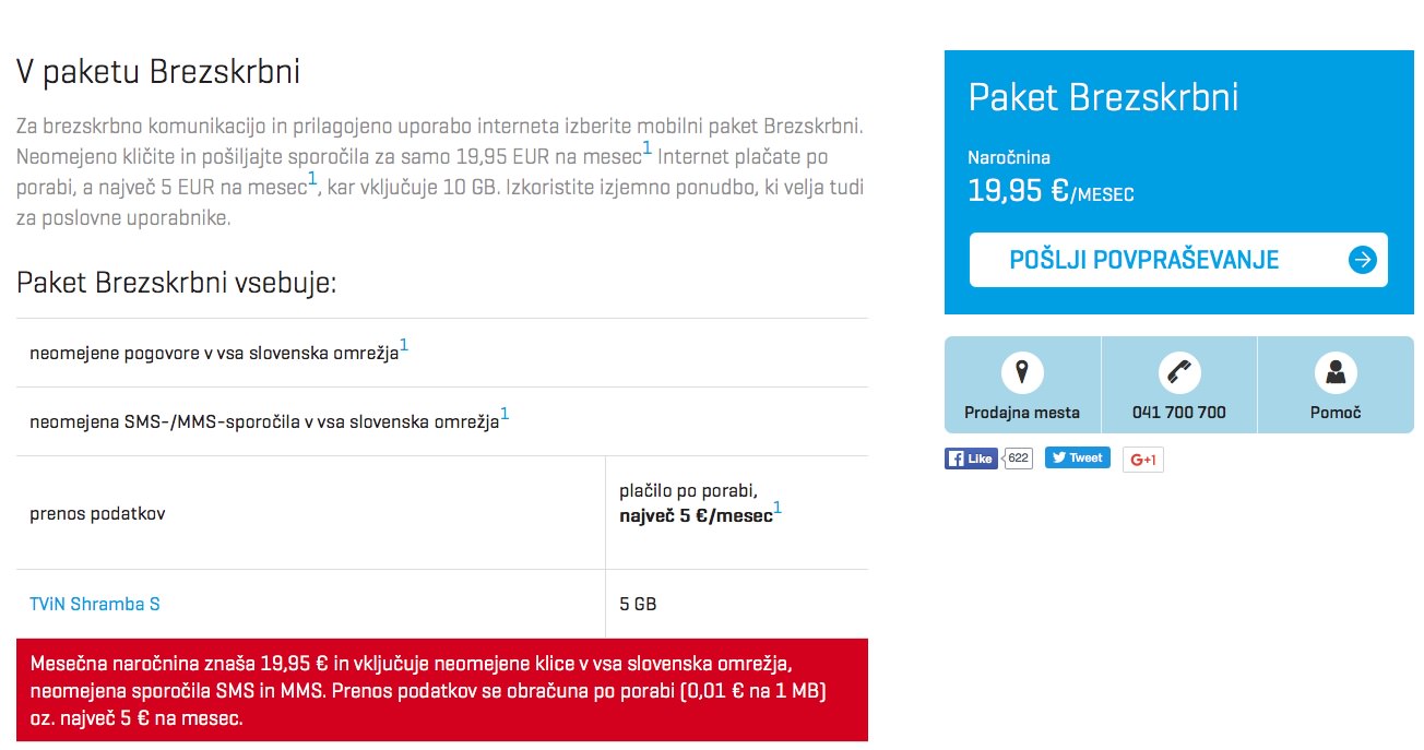 ** Prenos podatkov v mobilnem omrežju Telekoma Slovenije se naročnikom obračuna po ceniku navedenega paketa (0,01 EUR/MB), vendar ne več kot 5 EUR na mesec.