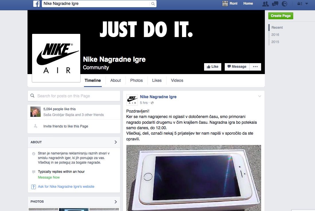 Ali ste vedeli, da Nike podarja na Facebooku rabljene telefone iPhone 6? Tudi jaz nisem. 100% sem, da niti Nike ne ve za to, da nekdo “v njegovem imenu” podarja iPhone 6 na Facebooku v skupini Nike Nagradna Igra.