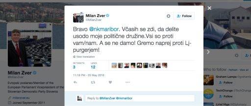 Evropski poslanec Milan Zver je uporabnik Twitterja. Zmago Maribora je včeraj izkoristil, da je napisal tvit, ki mogoče sodi za šank, nikakor pa ni to tvit, ki bi bil primeren za politika. Mogoče pa se ima on za politika, ki deli že tako razdeljeno Slovenijo. V takšnem primeru je njegov tvit odraz njegovega stanja