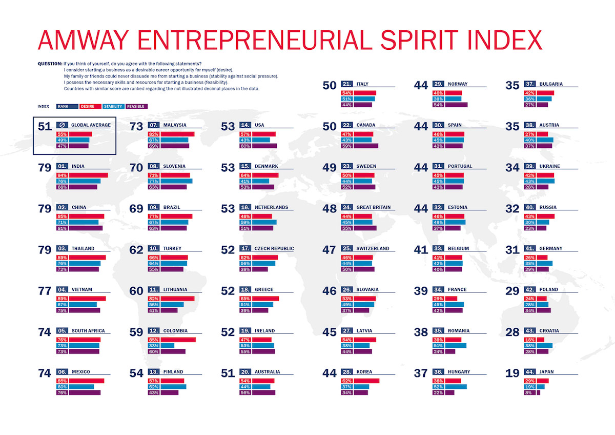 Podjetje Amway vsako leto opravlja globalno raziskavo, v kateri raziskuje odnos do podjetništva v posameznih državah, med drugim tudi v Sloveniji. Ključni izsledki o splošni podobi Slovenije nakazujejo počasno okrevanje gospodarstva in rast mednarodne konkurenčnosti tržno usmerjenih, inovativnih podjetij v zasebni lasti. Razvoj slednjih v projektno delo ali start-up podjetja najbolj pritegne nadarjene, mlade in izobražene posameznike, ki v podjetništu v največji meri iščejo samoizpolnitev oziroma možnost uresničitve lastnih idej. V primerjavi z evropskimi rezultati Amwayeve raziskave je delež Slovencev, ki v podjetniški praksi iščejo samoizpolnitev višji za kar 18 odstotnih točk.