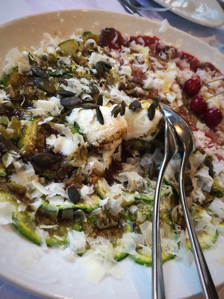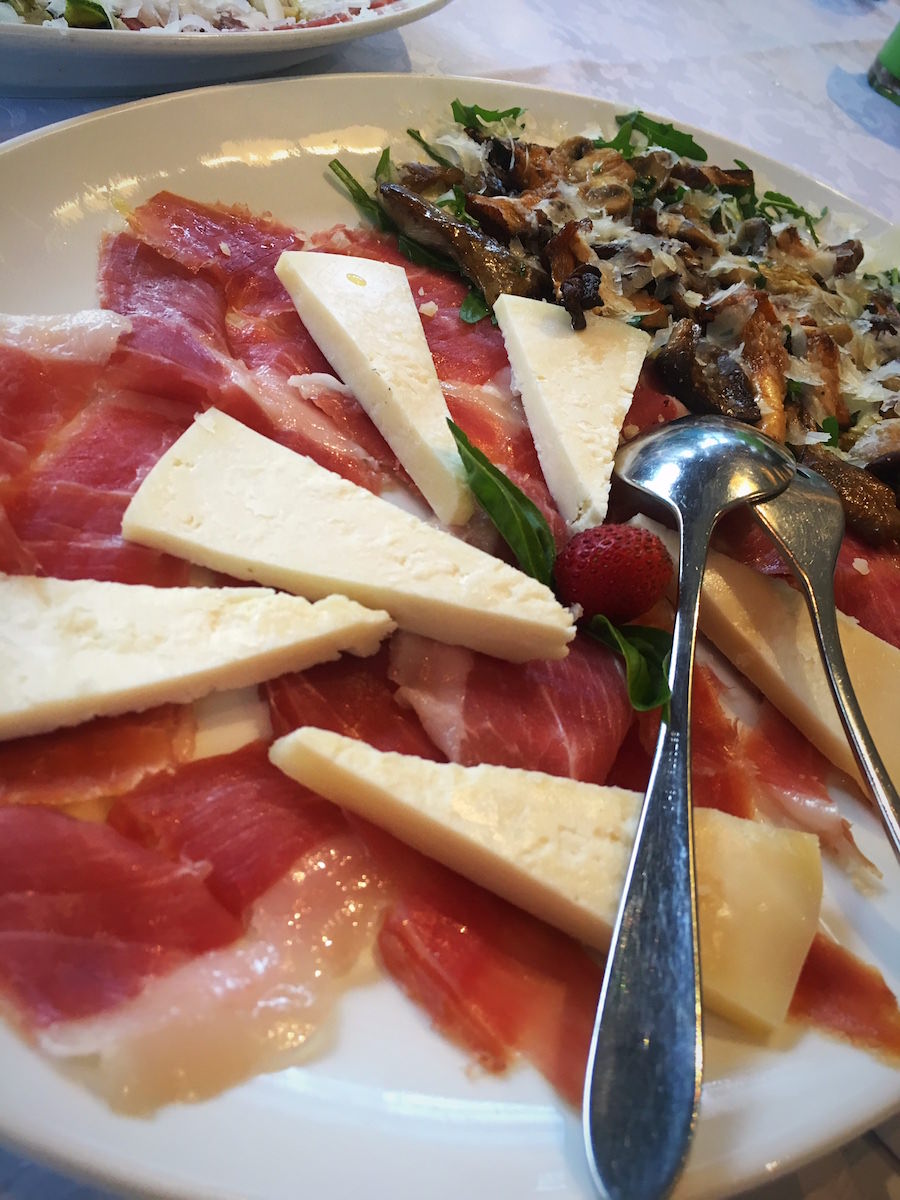Najprej smo na mizo dobili popečen kruh s smetano in črnim tartufom. Nadaljevalo se je z dvema krožnikoma hladne predjedi – salama, carpaccio, sir,… edina škoda, ker je vse bilo prekrito z rukolo in sirom / na splošno je v tem delu Istre večina jedi postrežena tako. Zanimivo je, da domačini čez vse to polijejo še veliko olivnega olja. Meni najboljši del so bile sveže pečene gobe – za katere bi dal roko v ogenj, da niso gobe, ampak piščanec.
