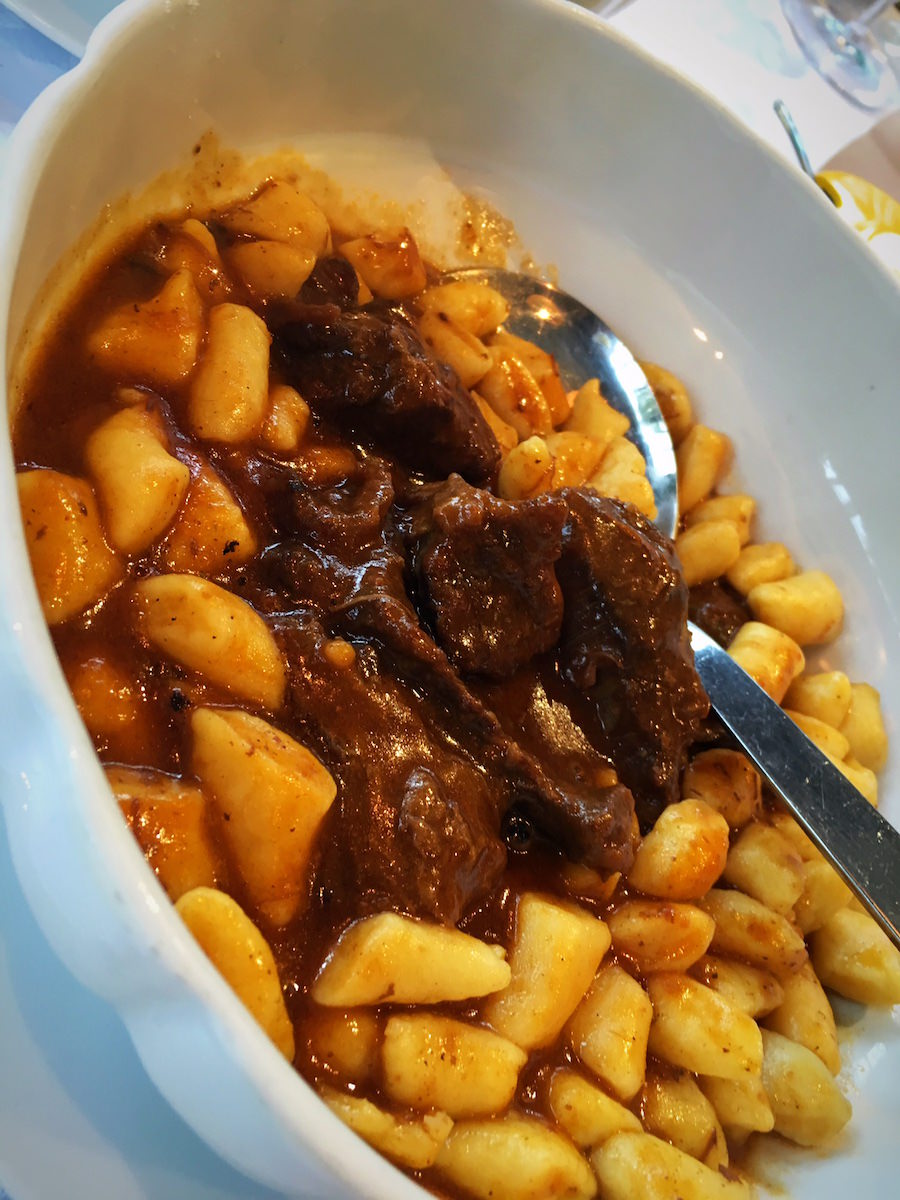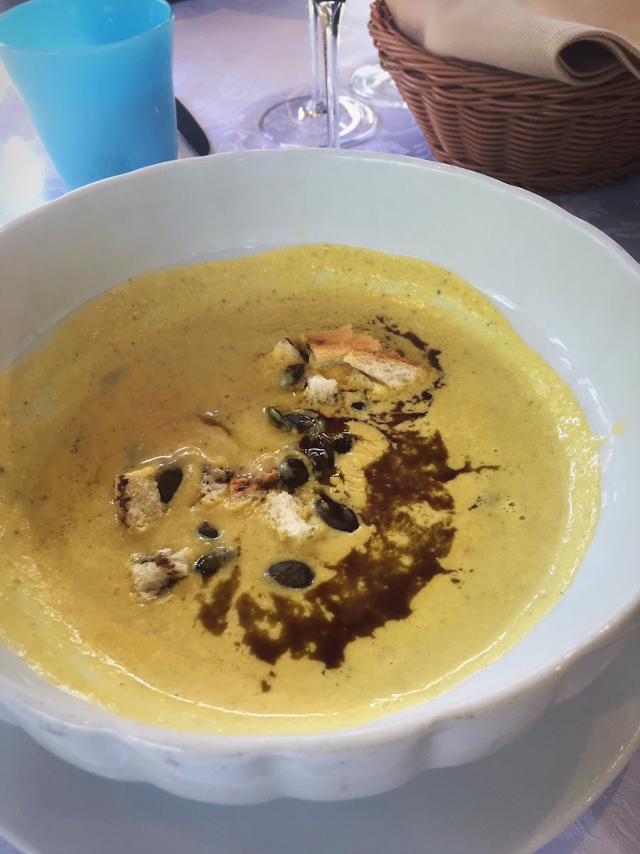 Naslednja jed sta bili juhi – iz divjih špargljev in bučk. Odlično in okusno. Sledila so “vmešana” jajca z veliko porcijo črnih tartufov. Ljubitelji tartufov bi verjetno skakali v zrak od veselja, saj pri tartufih ne “šparajo”. Naslednji dve jedi sta bili fuži z obilno porcijo tartufov in domači njoki z boškarinom.