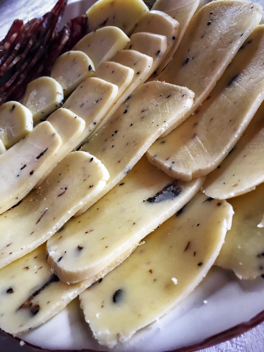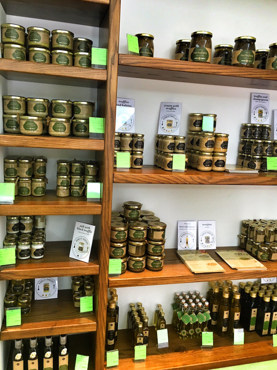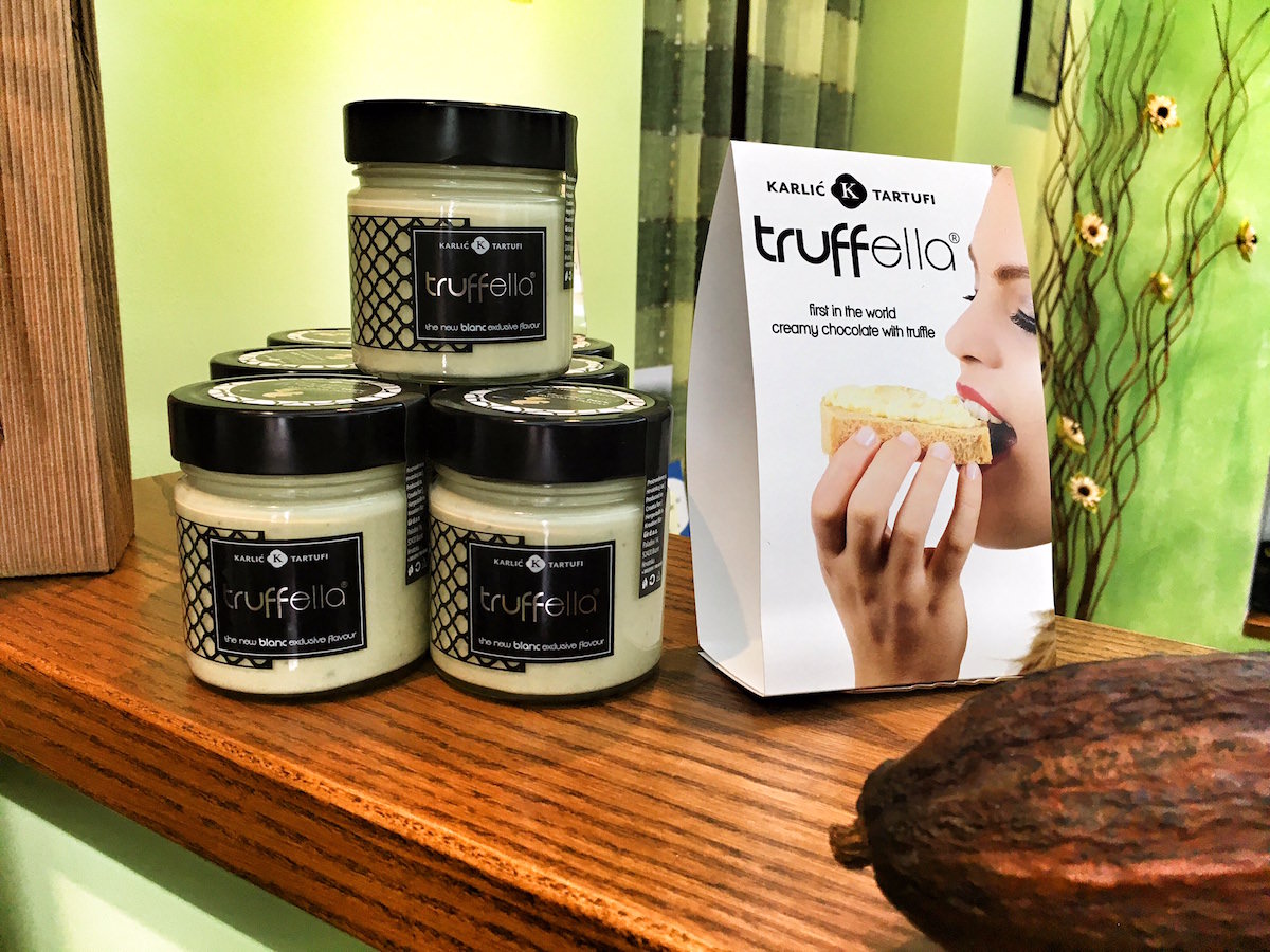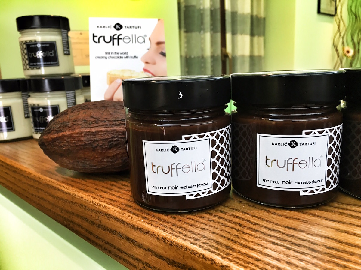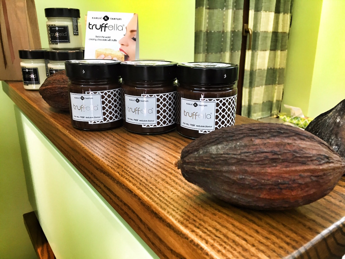 Ko smo prišli na obisk in na lovljenje tartufov k družini Karlić, ki se s tem ukvarja že vrsto let, smo najprej dobili hrano z njimi / ovčji sir, kozji sir, salama – seveda vse s tartufi. Ni šlo niti brez frtajle z njimi. Nadaljevalo se je s preizkušanjem različnih pijač z dodanimi tartufi, predvsem pa je bil pogled na njihovo trgovino, kjer imajo neskončno izdelkov povezanih s tartufi. Med najbolj zanimivimi je trufella / nutella z dodatkom …. Ja, prav ste uganili, belo in črno čokolado so povezali s tartufi.