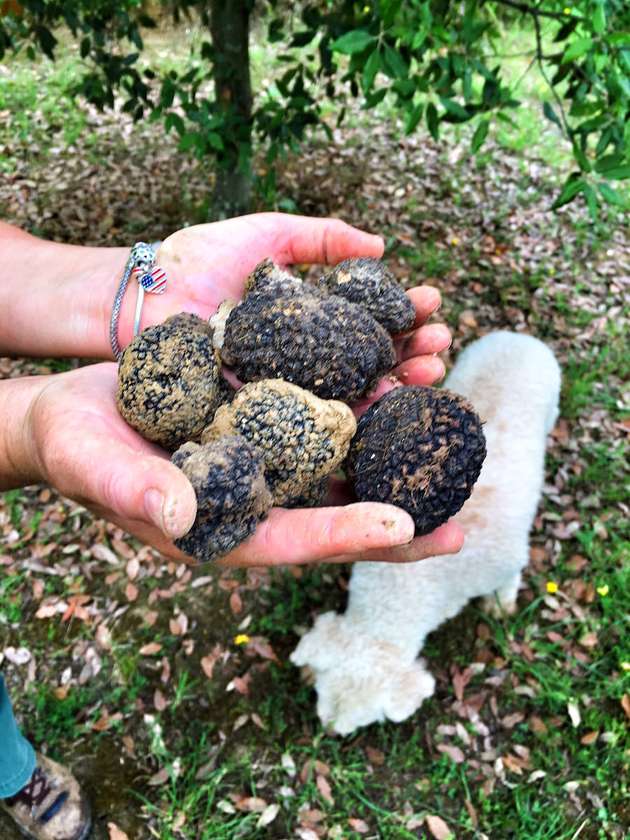 Za lovljenje (nabiranje) tartufov se uporabljajo različne pasme psov. Pse je treba od malih nog učiti o vonju tartufov, predvsem pa jih je potrebno vzgojiti v to, da ko najdejo tartuf, da ga ne pojedo, ampak da začnejo zgolj kopati okoli njega. Ko smo šli v gozd, sem odkril, da je teorija nekaj, praksa pa nekaj drugega in da so ti psi res dobro natrenirani in vedno najdejo tartufe. V desetih minutah v gozdu sta dva psa našla za preko 150 eurov tartufov.