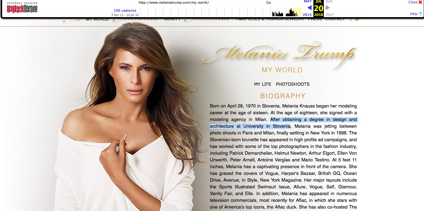 Seveda to ne drži in posledično so mediji v ZDA imeli precej veselja s to zgodbo! Kljub temu, da je bilo spletno mesto umaknjeno, pa je še vedno mogoče dostopati do informacij, ki jih hrani Internet Archive Wayback Machine – https://web.archive.org/web/20160720172020/http://www.melaniatrump.com/my-world
