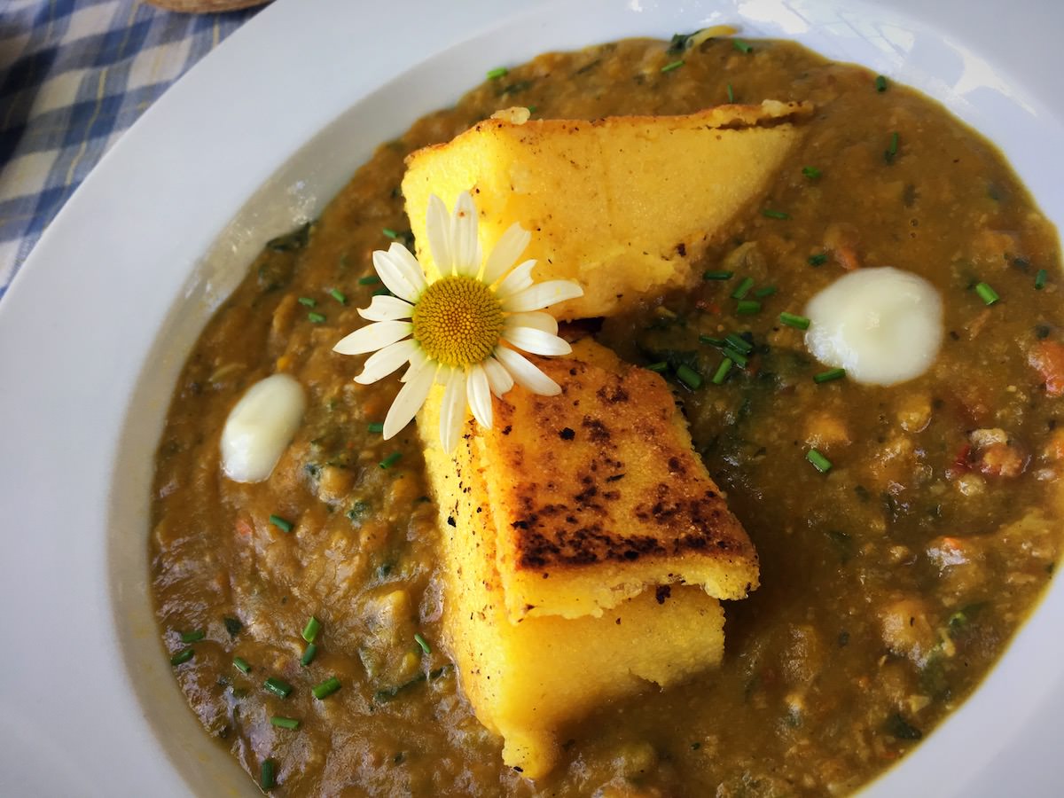 Juha je bila špinačna, z različnimi dodatki in zelo okusna. Presenečen sem bil, ker sicer nisem ljubitelj špinače, ker je imela okus po “prežganki” – kasneje sem ugotovil, da zaradi “čebulne paste”. Solata je bila listnata s čičeriko. Glavna jed pa polenta, ki prav tako ni na mojem spisku najbolj priljubljene hrane in omaka iz čičerike, bučk in ostale zelenjave z dodatkom zelene in ostalih začimb. Za sledico pa je bil veganski jabolčni zavitek s kremo iz malin in karamelo.