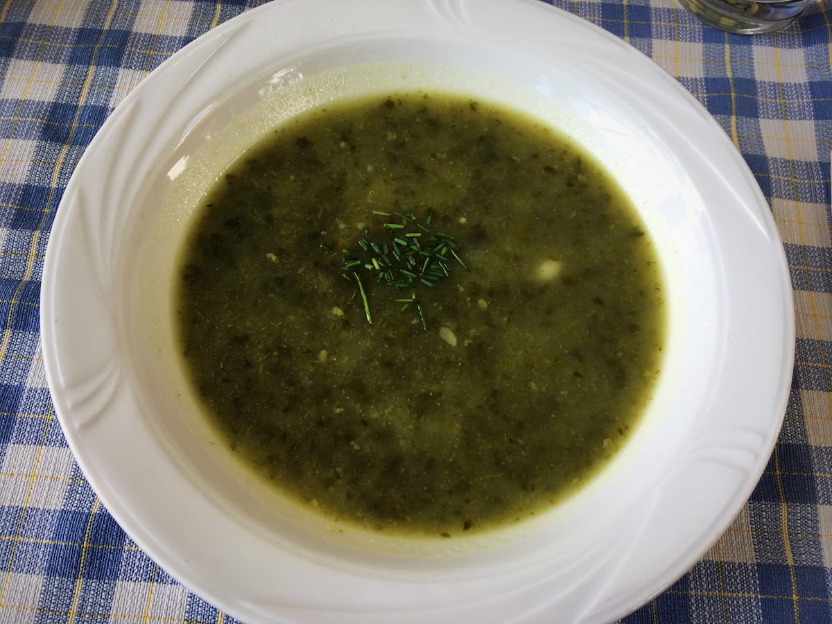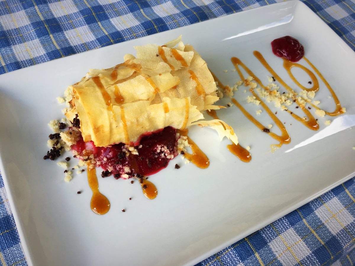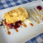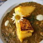 Juha je bila špinačna, z različnimi dodatki in zelo okusna. Presenečen sem bil, ker sicer nisem ljubitelj špinače, ker je imela okus po “prežganki” – kasneje sem ugotovil, da zaradi “čebulne paste”. Solata je bila listnata s čičeriko. Glavna jed pa polenta, ki prav tako ni na mojem spisku najbolj priljubljene hrane in omaka iz čičerike, bučk in ostale zelenjave z dodatkom zelene in ostalih začimb. Za sledico pa je bil veganski jabolčni zavitek s kremo iz malin in karamelo.