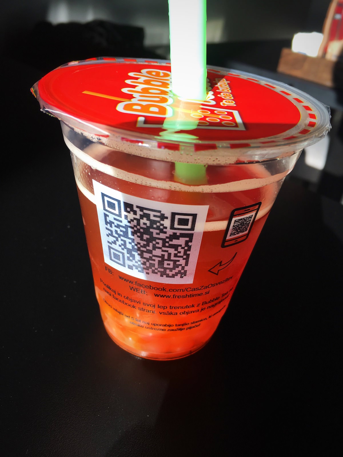 Druga stvar pa je Bubble tea, ki je očitno v teh dneh pravi hit v Ljubljani, saj je v pol ure vstopilo v Tloft cel kup mladih, ki so naročili to pijačo. Seveda sem jo tudi jaz – nič posebnega v bistvu. Sladek “čaj” (mehurčkasta pijača), ki pa ima dodane zračne kroglice (sami izberete okus, ki ga potem dobite v obliki kroglic / kvadratkov dodanega v samo pijačo). Mene pijača ni navdušila, predvsem pa mi je bila brez okusa.