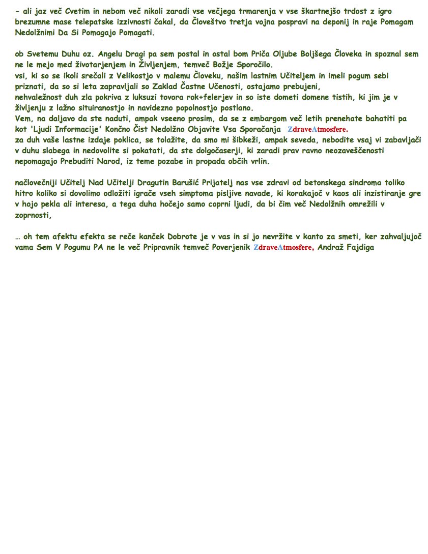 načlovečniji Učitelj Nad Učitelji Dragutin Barušić Prijatelj nas vse zdravi od betonskega sindroma toliko hitro koliko si dovolimo odložiti igrače vseh simptoma pisljive navade, ki korakajoč v kaos ali inzistiranje gre v hojo pekla ali interesa, a tega duha hočejo samo coprni ljudi, da bi čim več Nedolžnih omrežili v zoprnosti,