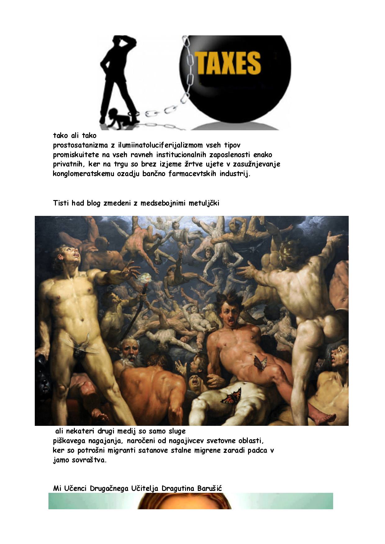 - Draga, v tintari prazna Joškica, vidi se, da si plitek sledilec itak neresnice, ker had je hladen, vse bolj si nažalost površen, zgolj puščava z možganskimi vijugami, prava rasna slovenska debilčina, sicer se ti nebi prikradlo zajebavati Nedolžne s sranjem iz ust ozadarjev, ker si z ušesi stara wc šoljka za driskance, ker te ohranjajo za septično jamo. Zdaj drek med dreki nadaljujmo, z ogledalom tvojega sovraženja, da; Hitro Se Boš Seznanil S Stvarnostjo, Da Te Imajo Šovinisti Temnega Šova Edino Za Toaletni Papir, Ko Si Lastno Slinavost Riti Brišejo S Tvojimi Zarjavelimi Možganskimi Vijugami. Ampak s teboj ni nič narobe, temveč so ti samo starši napačni, ker so te haddikepno vzgojili in zato si tragična špica za komedije z najbolj tupim hujskanjem s podmiznim ciljanjem na tarčo z nazivom ‘hetero ljudje’ da naj bi bili Joškanec, kako se ti sedaj zdi umazano vtikanje v ZdravoAtmosfero zaradi nategunov, ki te novačijo kvariti Nedolžne Slovence, ker te itak imajo med že številnimi dvorskimi norčki za še eno potrošno budalo na kubik. Laž ima kratke noge in ko bi vsaj kanček poštenosti, seveda cenjenja poznal, bi se res seznanil, da je učitelj Dragutin Barušič pomagal več Slovencem od vseh vas opic, opičenih iz daljave prdeti s podtikanji. LEPO TE PRIJATELJSKO USMERJAMO, DA SI IZ NAS NITI V POMISLEKIH NEDELAJ NEPRIJATELJE, KER NEVEŠ V KATEREMU GRMU LEŽI ZAJC, A KO BO PREPOZNO, SE TI BO MAMICA JOKALA, DA SI RAZVAJENEC RAZOČARAL OČETA, KER POLICIJA VAS JE PRIČELA ČEKIRATI IN KMALU VAS BO NIČEVNO KRDELO ZAČELO OBISKOVATI ….. IN TAKO JE PRAV, KER NOBENI NIMAJO PRAVICE ZASTRUPLJATI SVOJ LASTNI NAROD. Pred dobrim letom, nas je bežajoče rondalo napadlo s fatamorgansko halucinacijo in se utišalo v pripravljanju pokvarjenih nadaljevank, a ti butl za te podobne garjavosti, nadaljuješ zastrupljati Slovenske Državljane, češ ti nič neveš pa s samodopadanjem še naprej frajerčkaš pretveze, da vi senčarji nič neširite prozorne dezinformacije. Zmešanec, dovoljuješ se samodokazovati z zavajanjem in tako v prebrisance novačiti bolj glupe od sebe, da so vaša samoprevarna podtikanja lastnemu Narodu, kot zeljnik ZdraveAtomosfere. Užaljenec, kakšen namen ti je omenjati ZdravoAtmosfero, ko se prizadet zapletajoč samoomalovažuješ v neznanje pomena …. kdaj si pa videl, da ljudje brez šole znajo, ampak zato gredo v šolo, a ni tako, možganska klošarčina …. ne se bat, ker Mi Radi Educiramo vse nadobudne na njihovi lastni stopnji in verjemi nam, da niso več tako zelo bolani in ti si boš hiter ozdravil jezičino s katero Narodu razodevaš, da se te bo sramoval. Jebeki, ljubosumnost pokazuje surovost vas bednih ”SP” luzerčkov s plagijatskimi koraki v kvazi hoji. Res, niste samo gnide in ni nič čudnega, da pred Dobroto trpite, ker pred Plemenitostjo si vsaka surovina z navado gnoji samomuke in kar se nas ZAsrčkov tika, vi samo nadaljujte pomagati nam prešteti vas idiote in bodite vztrajni, a vseeno neboste Na Moralo odporni. PRISPOMNI SE DA, SMO TI SAMO DOZA OGLEDALA NABOJA V TEBI, PA LAHKO POČIŠ, DA TI AROGANCO SPRAVIMO V KANTO ZA SMETI, KJER JI JE, KOT ENAKO VSEM HLADNOKRVNIM BITJEM OČITNA DESTINACIJA IN ČAKAMO TE PA SI POTEPUH NEMISLI, DA SE NEBOMO URADNO SPOZNALI, KER RONI VAM VIJUGE NATEGUJE S PROGNOZO UTOPIJE, DA BO ZdravaAtmosfera KADARKOLI PRENEHALA. Se vidi, da ste nahujskani na Učitelja in nas, no tako zastonj kot zaman skrivate, da zlobo teh imbecilov nebomo razkrinkali. Zabitež drobnjarski, hvala ti, da si se izdal, da si samo potrček zlobnežev, ki te bodo itak kmalu skoraj zamenjali s številkico večjega škarta. SRAM VAS JE LAHKO VSE SKUPAJ, DA VAS KARIKATURNE, USPEVAJO SRBSKI LOBIČIČI KANDIDATURNO REKRUTIRATI ZA PODOBE SLOVENSKIH DRŽAVLJANOV. JOŠKALO NAHUJSKANO OD BANDE SLINAVE, POGLEJ SI NIŽJE PODPIS, A TOLIKO SI BEDEN, DA SE TI NITI NESANJA, KAJ TE BO, ČE SE NEBOŠ POKESAL, NAŠLO, KER TISTA FRAČA V IMENU DAME JE LEZBA IN SI KOT VSE KAČJE GNEZDO NA NJENE SIMPTOME LUCIFERIJAŠENJA SKUPAJ Z NJO V SINDROM SATANSKI PADEL. Seminarčica snežana kragelj in tečajčica novinarčica miška, ki po Bralcih tiho tiše najtiše snežinsko piška.