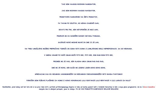 Dejansko razmišljam, da bi odrepal tale spodnji komad – sicer nimam posluha, ampak s tem besedilom ti niti posluh ne pomaga. Predvsem pa niti ne razumem, kaj so želeli s tem spodaj sporočiti. Zraven dodajam še del teksta elektronskega sporočila – predvidevam, da je čist hudo, če se ti tole dogaja v glavi. Mogoče pa je čas, da bi kakšne institucije poskrbele za te ljudi, kajti tole ni ok. Ponavljam. Tole ni ok!