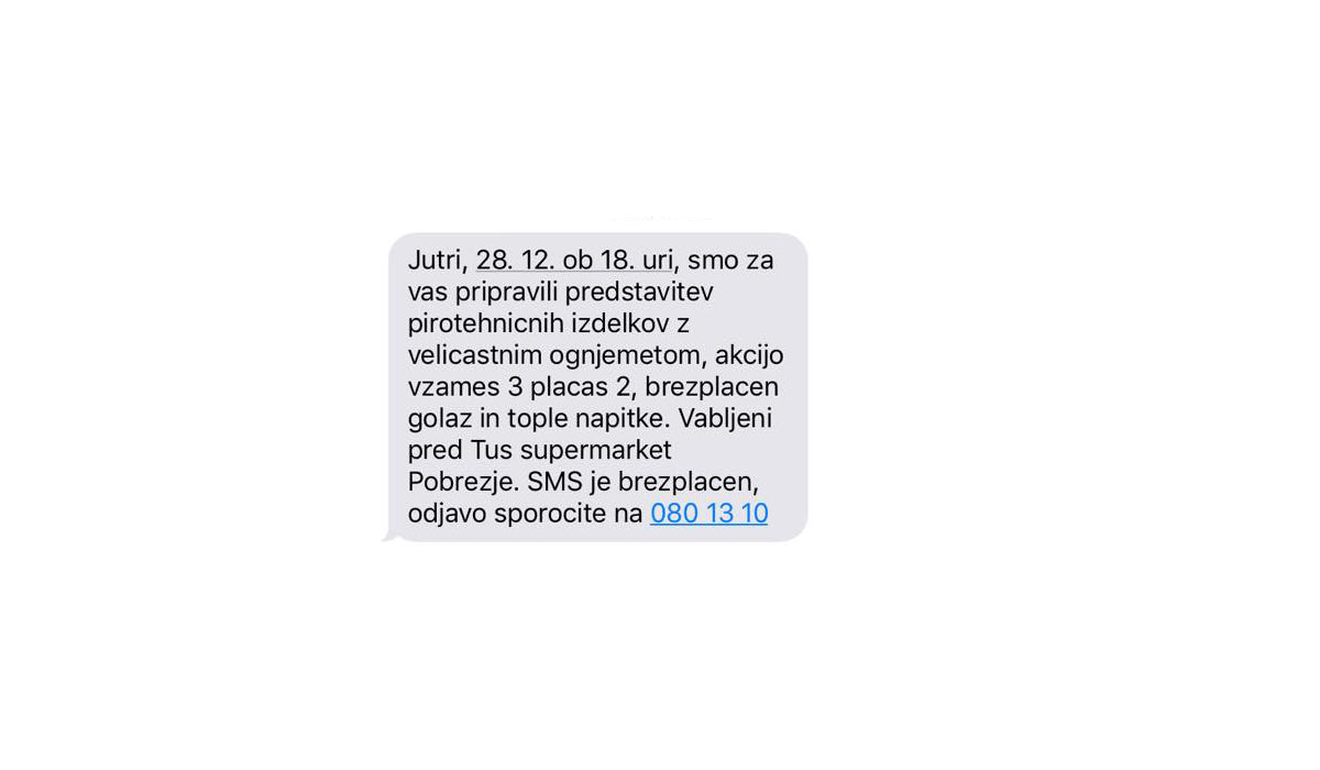 Petarde in pirotehnika. Smo v obdobju, ko se lahko uporablja pirotehnika kategorije 1. Kljub opozorilom stroke in dogodkom pred tednom dni (raztrgani roki), se je očitno določen trgovec odločil, da bo preko svojega Tuškluba poskušal “povečati” prodajo pirotehnike s pomočjo predstavitve pirotehnike, veličastnega ognjemeta, akcije vzameš 3, plačaš 2, brezplačnega golaža in toplih napitkov – pred Tuš marketom v Pobrežju.