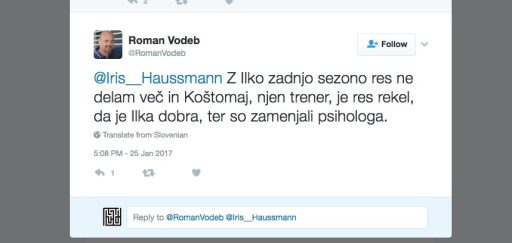 Zanimiv je podatek, da letošnje leto Ilka Štuhec ne sodeluje “s strokovnjakom” Romanom Vodebom, ki je to tudi sam javno objavil na Twitterju. Sicer, glede na to, da Roman Vodeb ni psiholog, me zanima kakšna je bila sicer njegova vloga pri Ilki Štuhec.