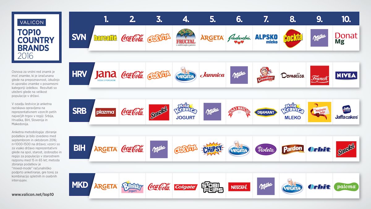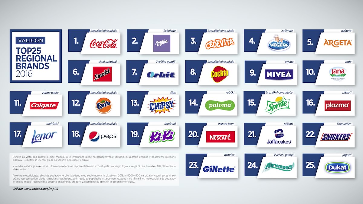 Tudi letos je Valicon predstavil lestvico TOP25 REGIONAL BRANDS. Rezultati za 2016 so – na prvem mestu je Milka izgubila dosedanji primat in je najbolj prepoznavna blagovna znamka postala Coca Cola. Na tretjem mestu pa je Vegeto zamenjala Podravka. V Sloveniji je najbolj prepoznavna blagovna znamka še vedno BarCaffe, na drugem mestu ji sledi Coca Cola in na tretjem Cedevita.