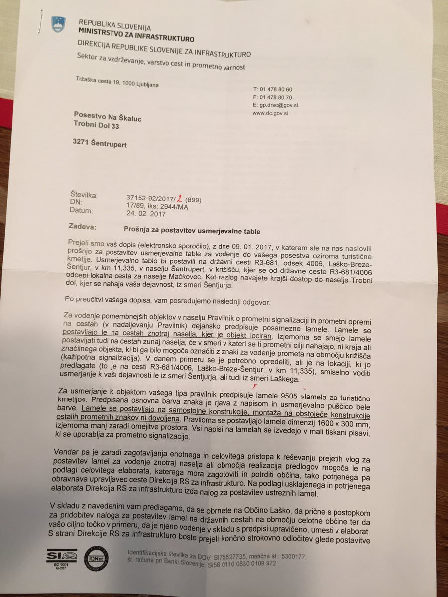 Posestvo Na Škaluc, iz okolice Šentruperta, je pred časom zaprosilo Ministrstvo za infrastrukturo za postavitev usmerjevalne table do njihove posesti – turističnega objekta. Razlog in želja za postavitev je označitev krajšega dostopa preko Trobnega dola. Dobili so odgovor. Po natanko 64 dneh..
