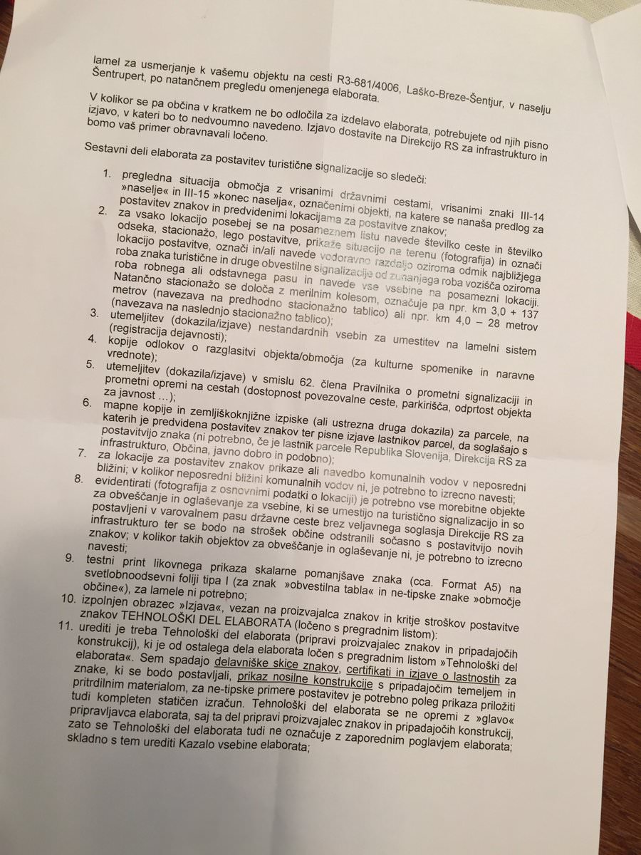 Za postavitev usmerjevalne table je potreben elaborat. Jasno! Ta elaborat mora vsebovati 12 točk. In ko greš brati, kaj vse mora biti v elaboratu – prej obupaš in še enkrat premisliš, ali si res želiš takšnih komplikacij. Razumem. Red je red. Pravila so pravila, predvsem pa zakoni so za vse enaki.