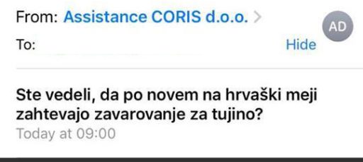 Ko dobiš elektronsko sporočilo z naslovom “Ste vedeli, da po novem na hrvaški meji zahtevajo zavarovanje za tujino?” klikneš nanj. Nepomembno je, da gre za zavajanje v naslovu, da bi čim več prejemnikov kliknilo in odprlo elektronsko sporočilo – šteje zgolj število odprtih sporočil, kajne Coris?
