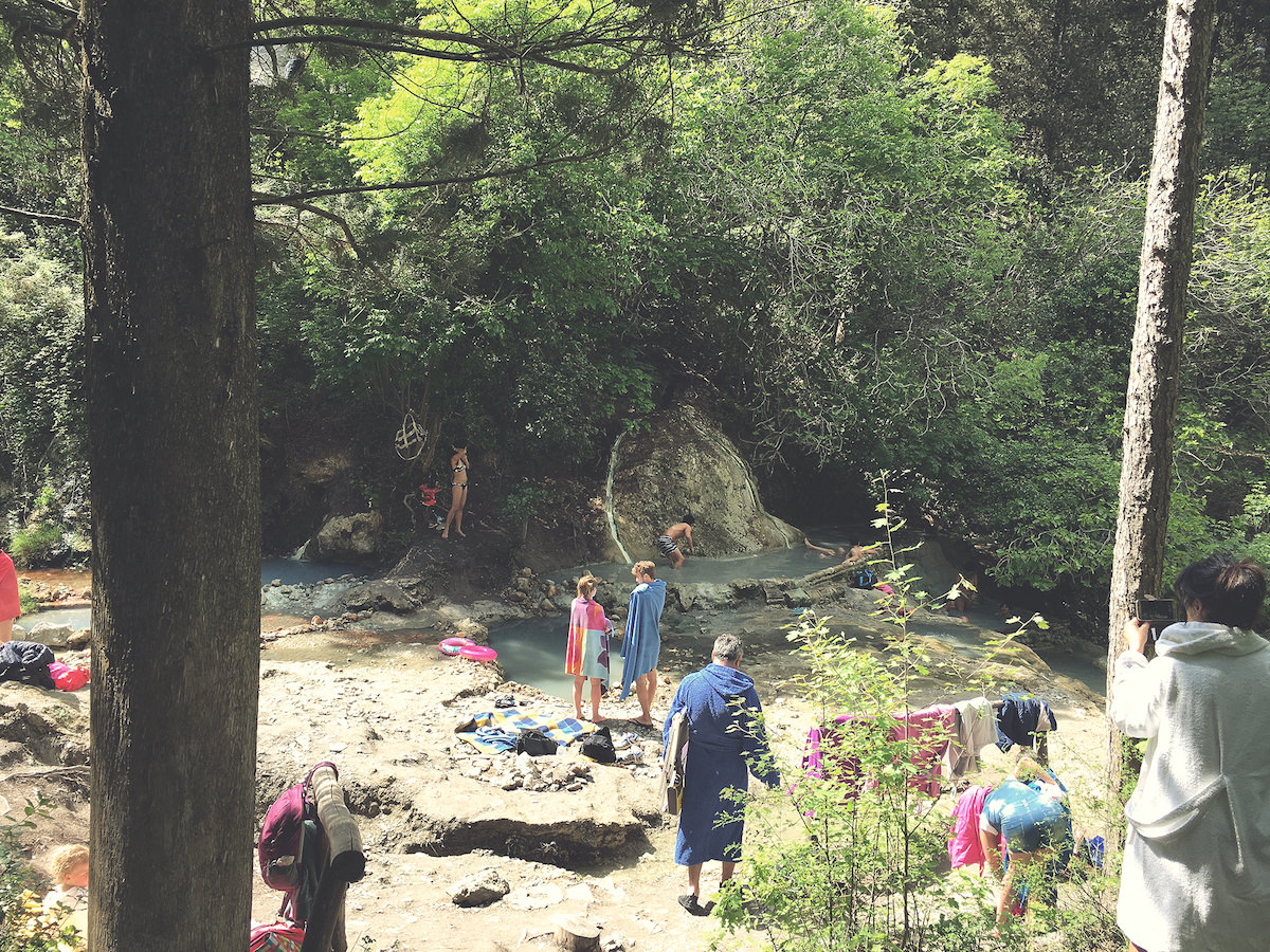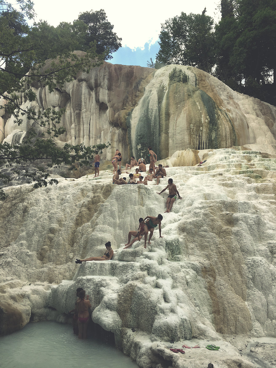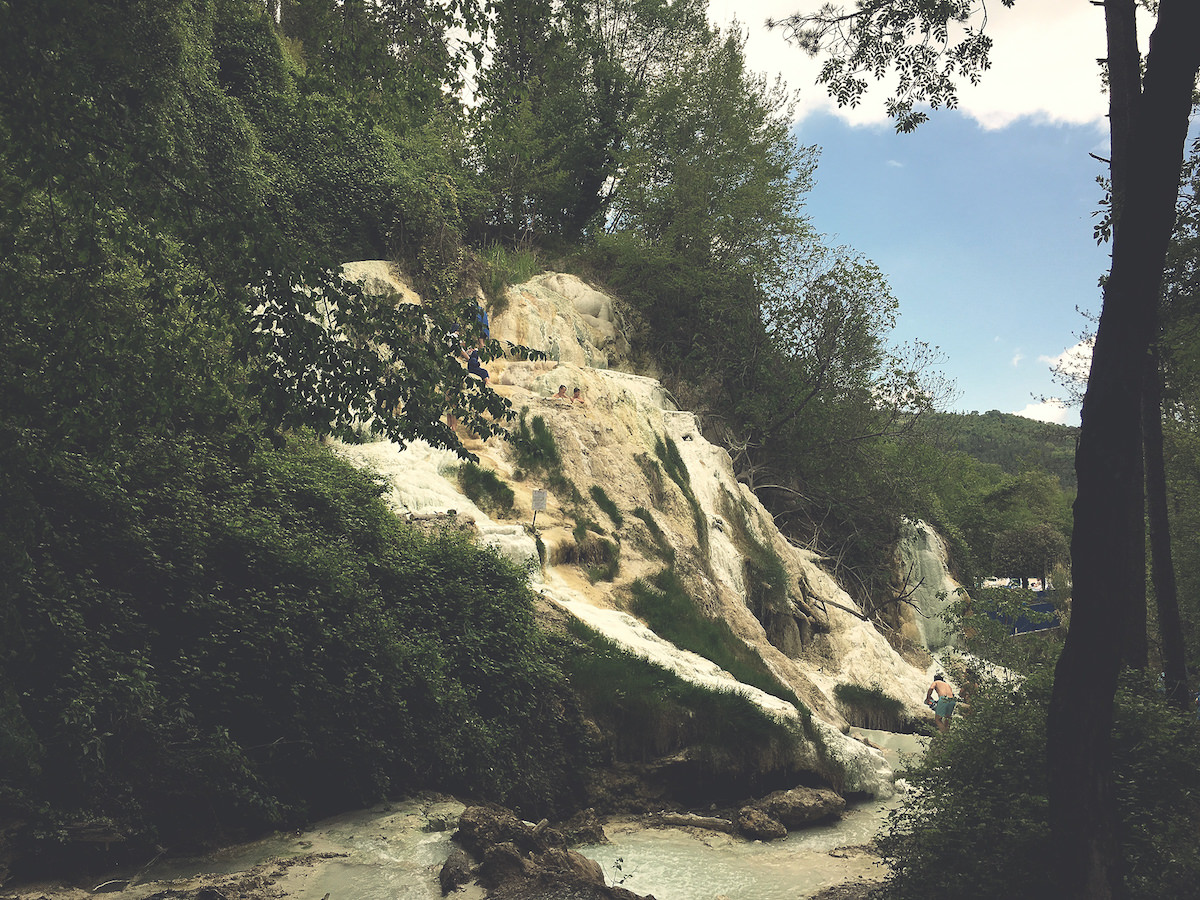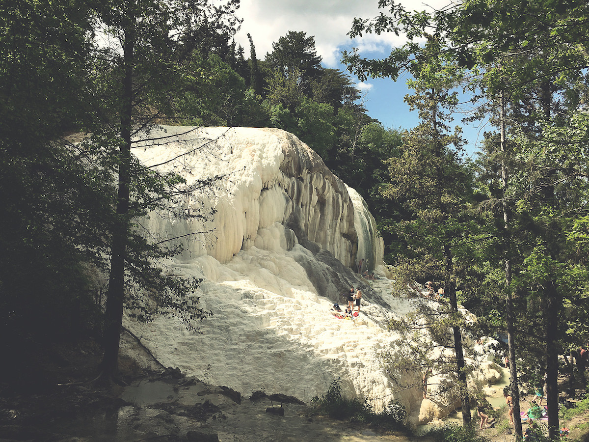 Vendar za izkustvo tople vode ni potrebno plačati vstopnine, ampak je dovolj sprehod čez gozd, do potoka, kjer mrgoli ljudi. Beli nanosi kalcija so me spomnili na Pamukale v Turčiji, vendar je bilo tukaj precej več ljudi v kopalkah, predvsem pa veliko bolj glasno – kot je v Italiji navada.