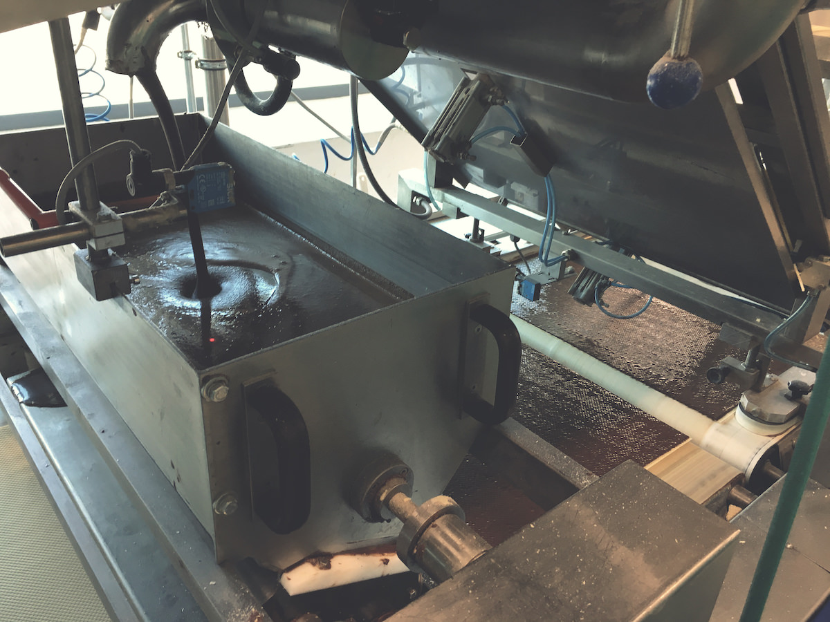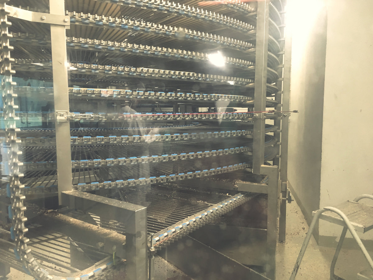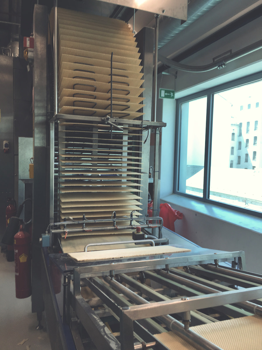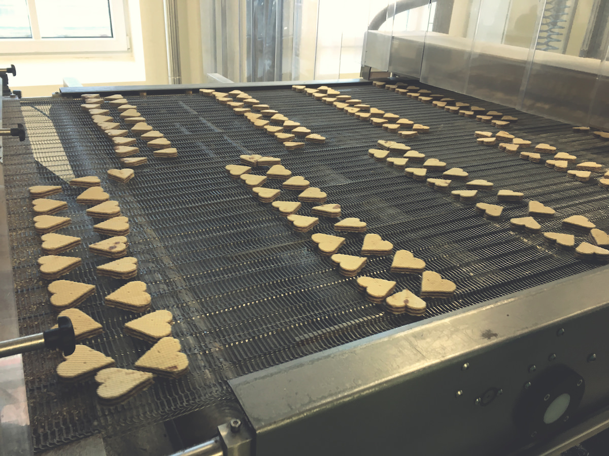 Pred vhodom v proizvodnjo smo se morali zaščiti, razkužiti in slediti navodilom. Večnadstropne hale so polne strojev, ki omogočajo proizvodnjo zadostnih količin napolitank in ostalega asortimana, ki ga podjetje ponuja – ne, ne izdelujejo samo napolitank. V spodnjem videu je kratek prikaz kako poteka izdelava napolitank, ki imajo skrivno formulo. 5 oblatov in štiri plasti čokoladne kreme, ki jo brizga stroj. Potem sledi sušenje in naprej na rezanje in pakiranje. Vse poteka avtomatsko in pod budnim očesom kamer in senzorje, ki avtomatsko preverjajo velikost, težo in pravilno obliko – če ni po standardu, gre v izmet.