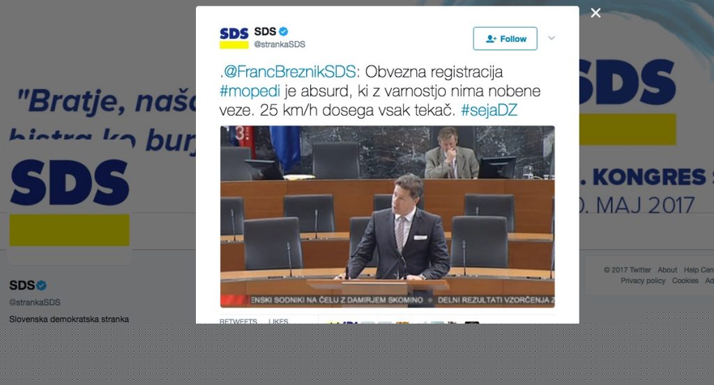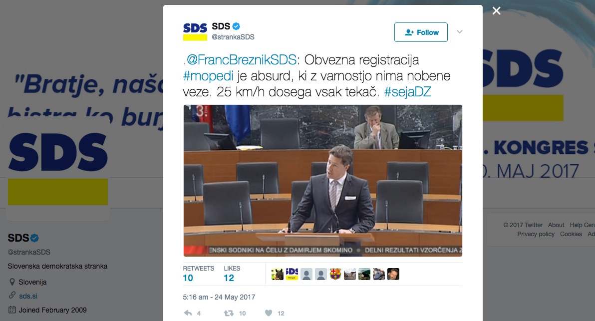 Franc Breznik zastopa SDS v državnem zboru. Je eden izmed tistih, ki je pred dnevi objavil fotografijo žrtev Yu komunizma – ki pa je bila seveda “fake news”. Tokrat je šel korak dlje. Namreč na Twitterju je stranka SDS povzela njegovo izjavo v parlamentu – Obvezna registracija #mopedi je absurd, ki z varnostjo nima nobene veze. 25 km/h dosega vsak tekač.