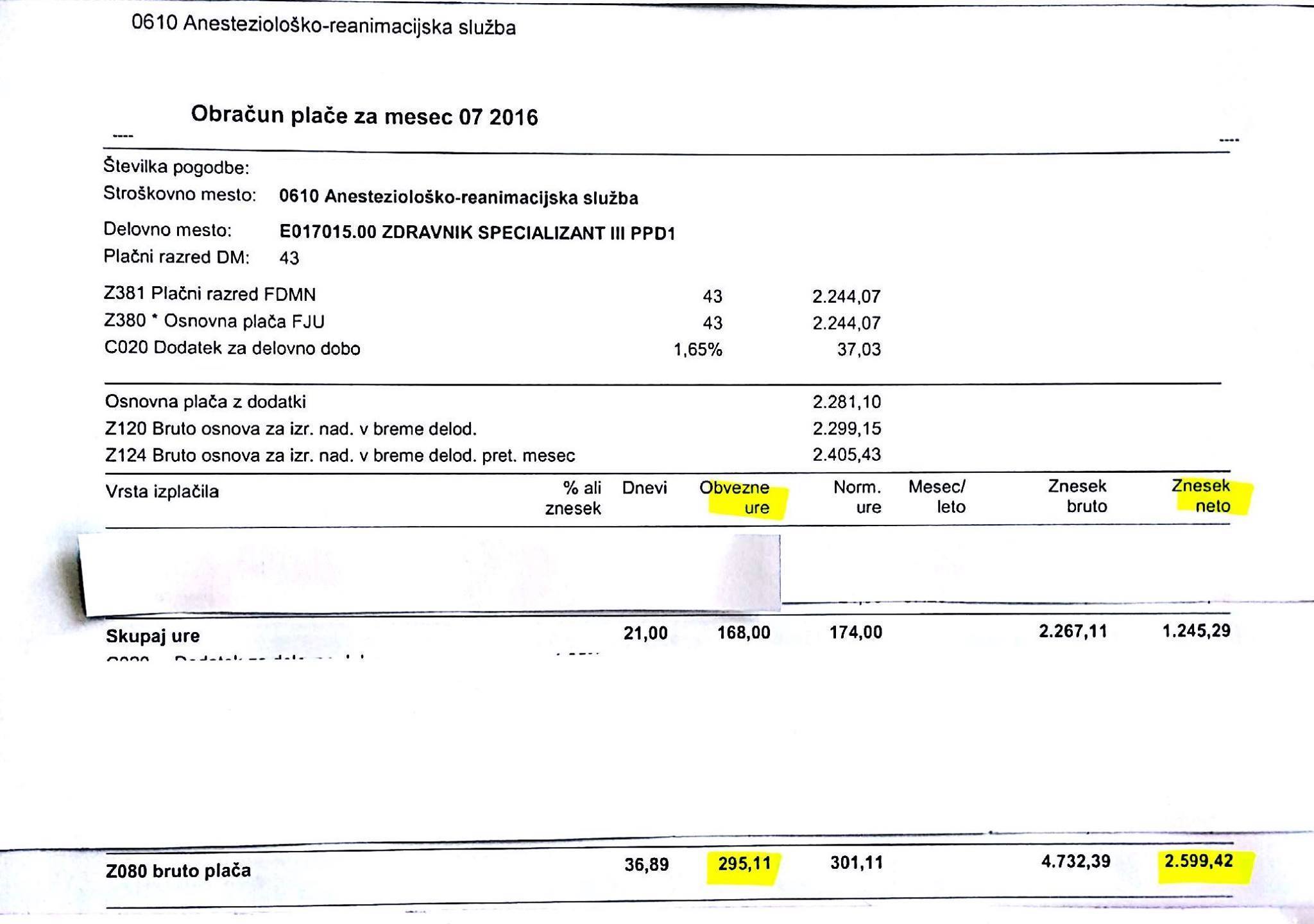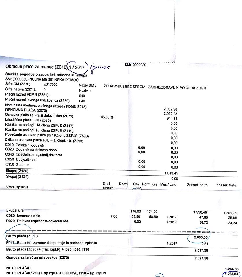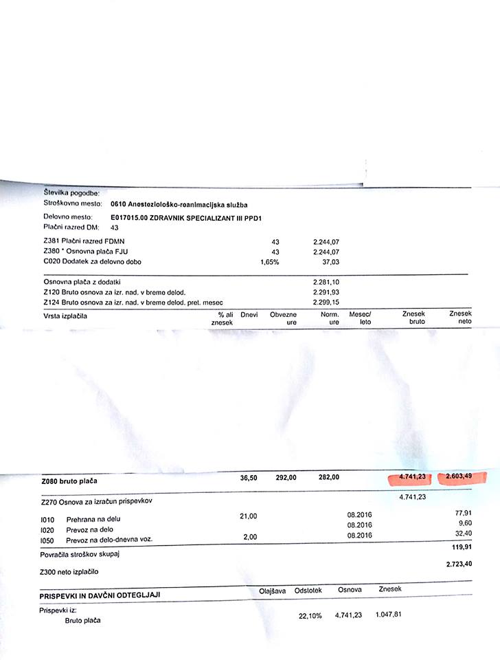 »Sem zdravnica specializantka in delam tudi po 260 ur na mesec, kar pomeni, da delam več kot 60 ur na teden. Vsak dan z elektronsko kartico beležim svoj prihod in odhod. Mnogo dni v mesecu pridem v službo zjutraj, nato ne grem domov ob 15h, ko se redni delovnik zaključi, ampak ostanem še popoldan in nato še ponoči. Naslednji dan ne grem po neprespani noči domov, ampak še ostanem na delovnem mestu, da oddelam svoje redno delo do 15h. V bolnišnici ne zmorem in ne želim delati toliko dnevov in noči, čeprav sem še v drugi polovici nosečnosti toliko delala zaradi hudega pomanjkanja zdravnikov, in to na urgenci! Delam torej za enega in pol zdravnika podnevi, ponoči in ob vikendih in zato prejmem tudi toliko višje plačilo. Kot dokaz prilagam plačilno listo za opravljenih 292 ur v mesecu in neto izplačilom 2603 evre.»