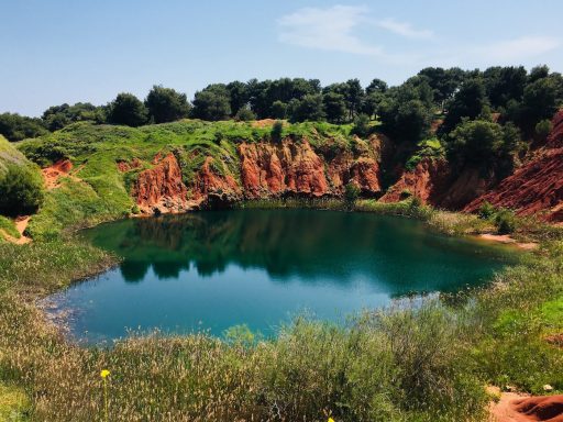 Sredi polj so kupi rdeče zemlje. In trume turistov “maširajo” tja. Ko jih opazuješ od daleč, ti ni povsem jasno, ko pa prideš bliže, pa se ti odkrije pogled na precej veliko jezero, ki je nastalo ob izkopavanju boksita, predvsem pa, ki je ostanek nekih drugih časov.