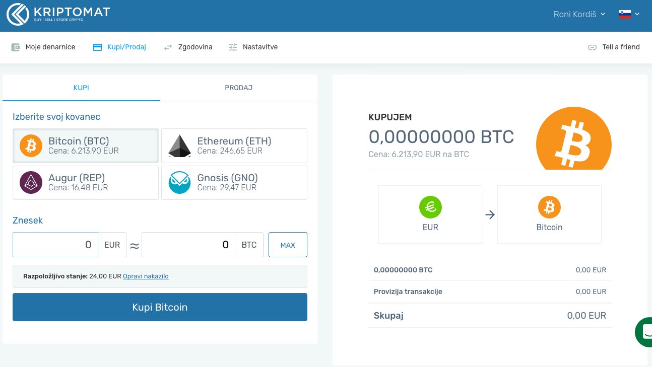 - po prilivu denarja na račun lahko kupite kriptovalute ali žetone – zaenkrat so na voljo valute BTC in ETH in žetona REP in GNO