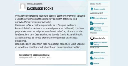 Za dostop do portala eUprava potrebujete digitalni certifikat in registracijo. Če nimate certifikata, si ga boste morali pridobiti – znotraj portala eUprava pa boste lahko pregledovali različne podatke, ki jih hranijo o vas – tudi kazenske točke in prometne prekrške iz evidence Policije. Ta del najdete na desni strani in potreben je zgolj klik …
