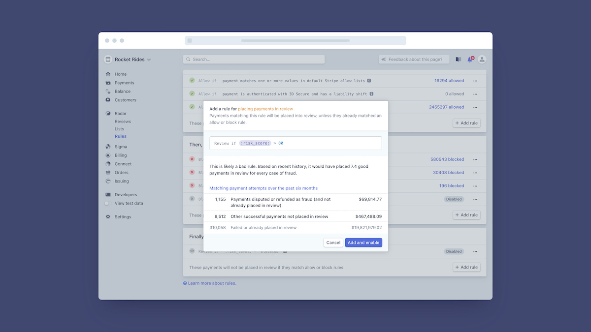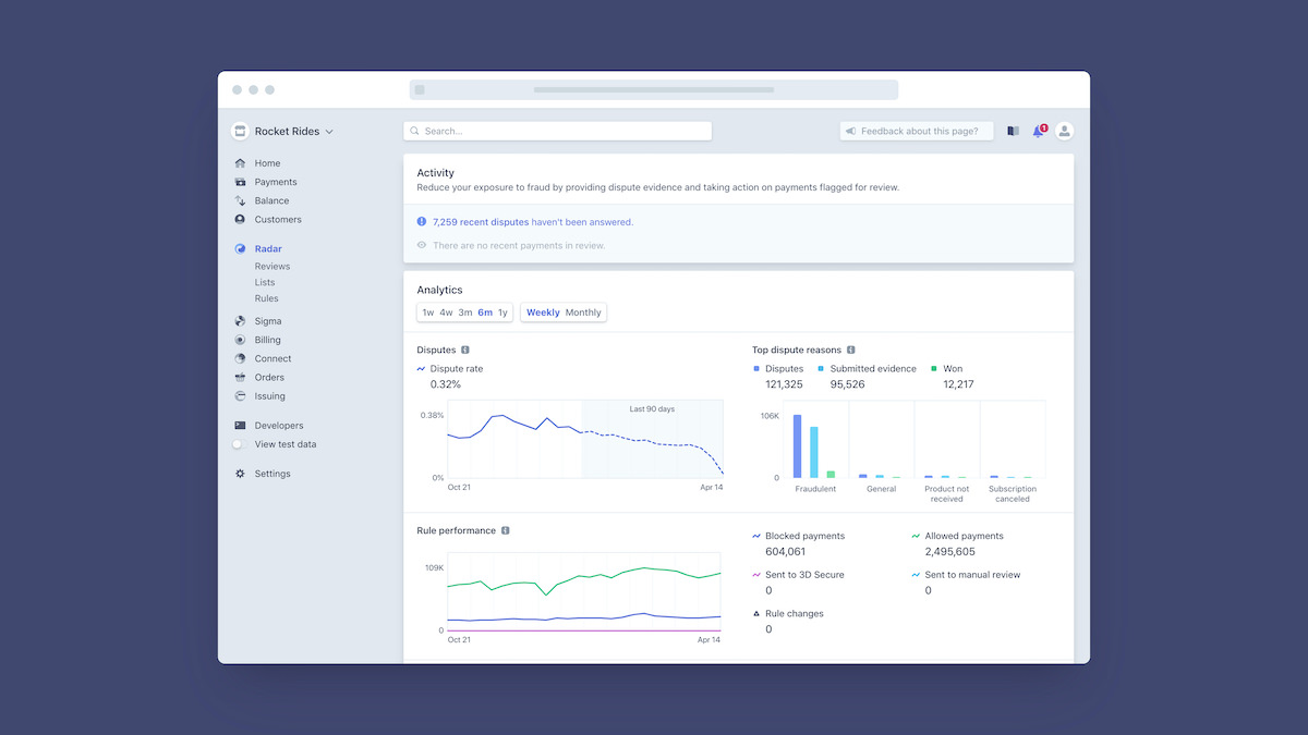 Stripe Radar je sklop orodij za preprečevanje goljufij, pri katerih se uporablja strojno učenje. V celoti je vključen v uporabniške račune Stripe, kar pomeni, da čas za njegovo namestitev ni potreben. Radar nenehno sprejema nova spoznanja in prilagaja zaščito na podlagi globalnih plačil in mreže Stripe: transakcij, ki jih platforma Stripe obdeluje za več milijonov podjetij, ki jo uporabljajo po vsem svetu.