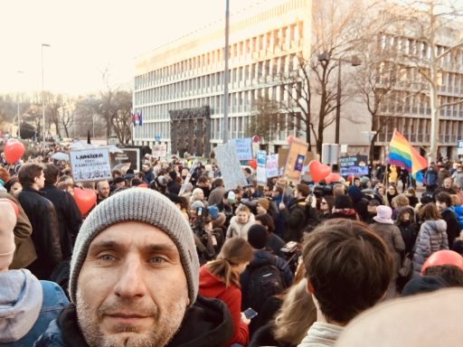 Ampak vse je bilo mirno. Kljub temu, da je RTV Slo poročala o par 100 udeležencih, nas je bilo krepko čez 2000. Če ne bi videl posnetkov iz zraka, ne bi trdil tega. Šlo je za strpen protest – ker najbolj od vsega me je bilo strah, da to postane to, kar so trdili desničarji da bo – zažiganje lutk, skandiranje sovražnih parol …