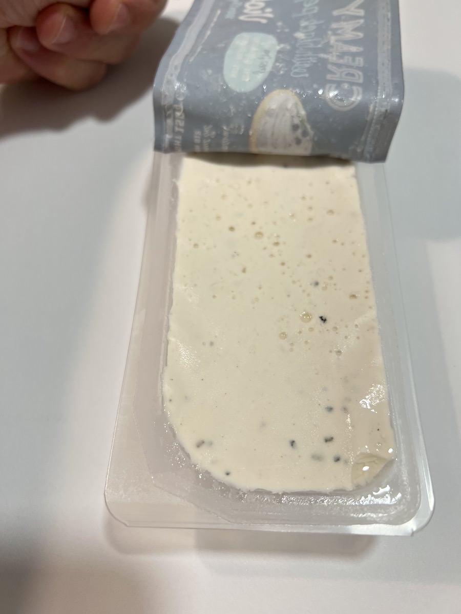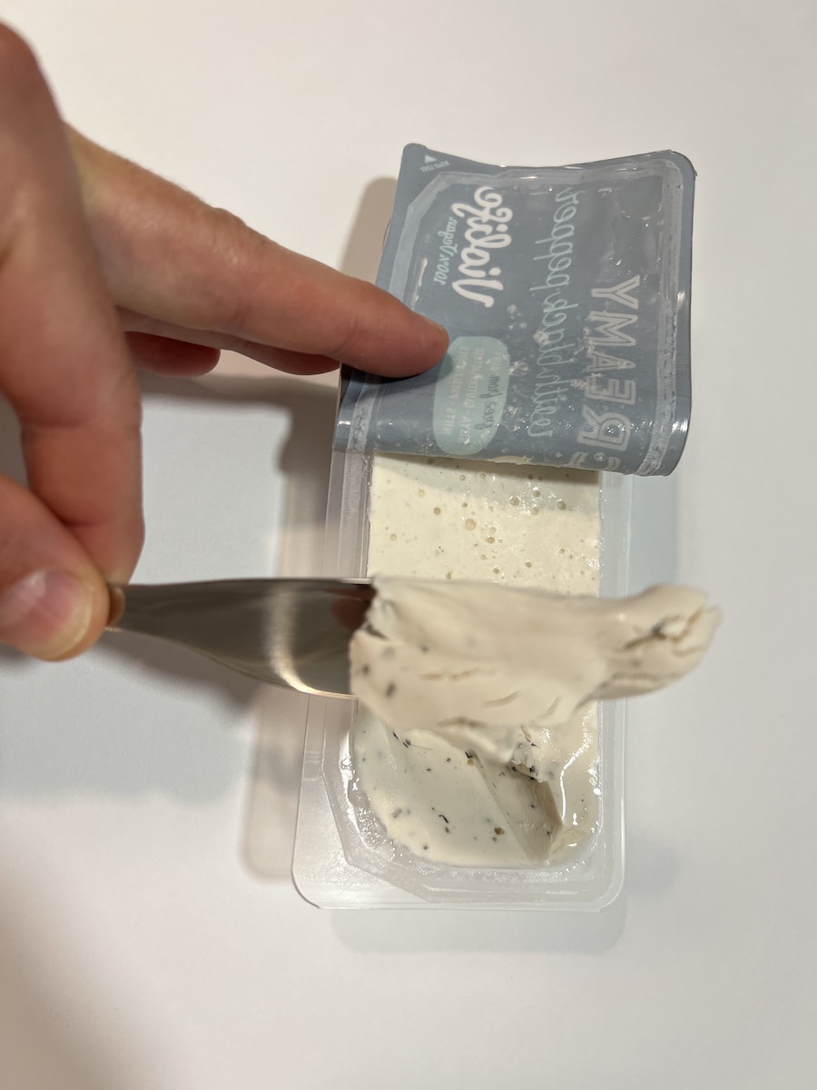 Pred dnevi sem v hladilniku našel ta “namaz”. Kot že zgoraj omenjeno ne iščem približkov hrani, ki je sicer ne uživam, vendar si dam možnost in poskusim, ko dobim karkoli takšnega v roko. Tudi Violife Creamy Black Pepper sem poskusil.