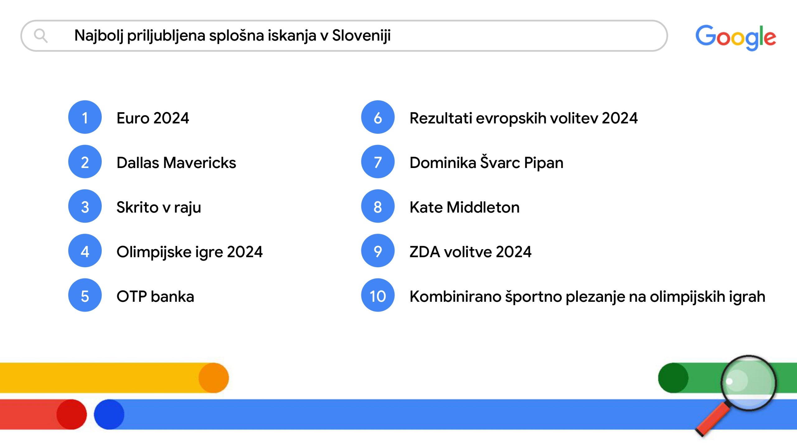 Med prvimi petimi najbolj iskanimi gesli so kar tri športno obarvana. Na drugem mestu najbolj iskanih gesel je ameriški košarkarski klub Dallas Mavericks, katerega ključni član ekipe je Luka Dončić, na četrtem mestu pa so Olimpijske igre 2024, ki so potekale letos poleti v Parizu.